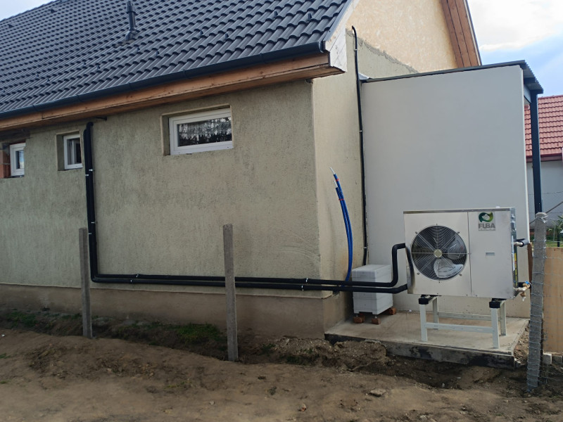 Meglévő fűtési rendszerrel össze kötött monoblokkos hőszivattyú, a kedvező fűtési költség érdekében.